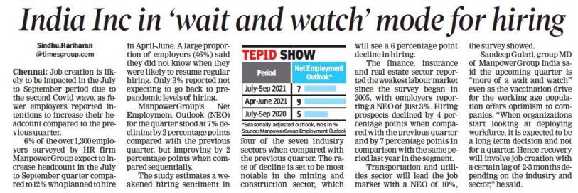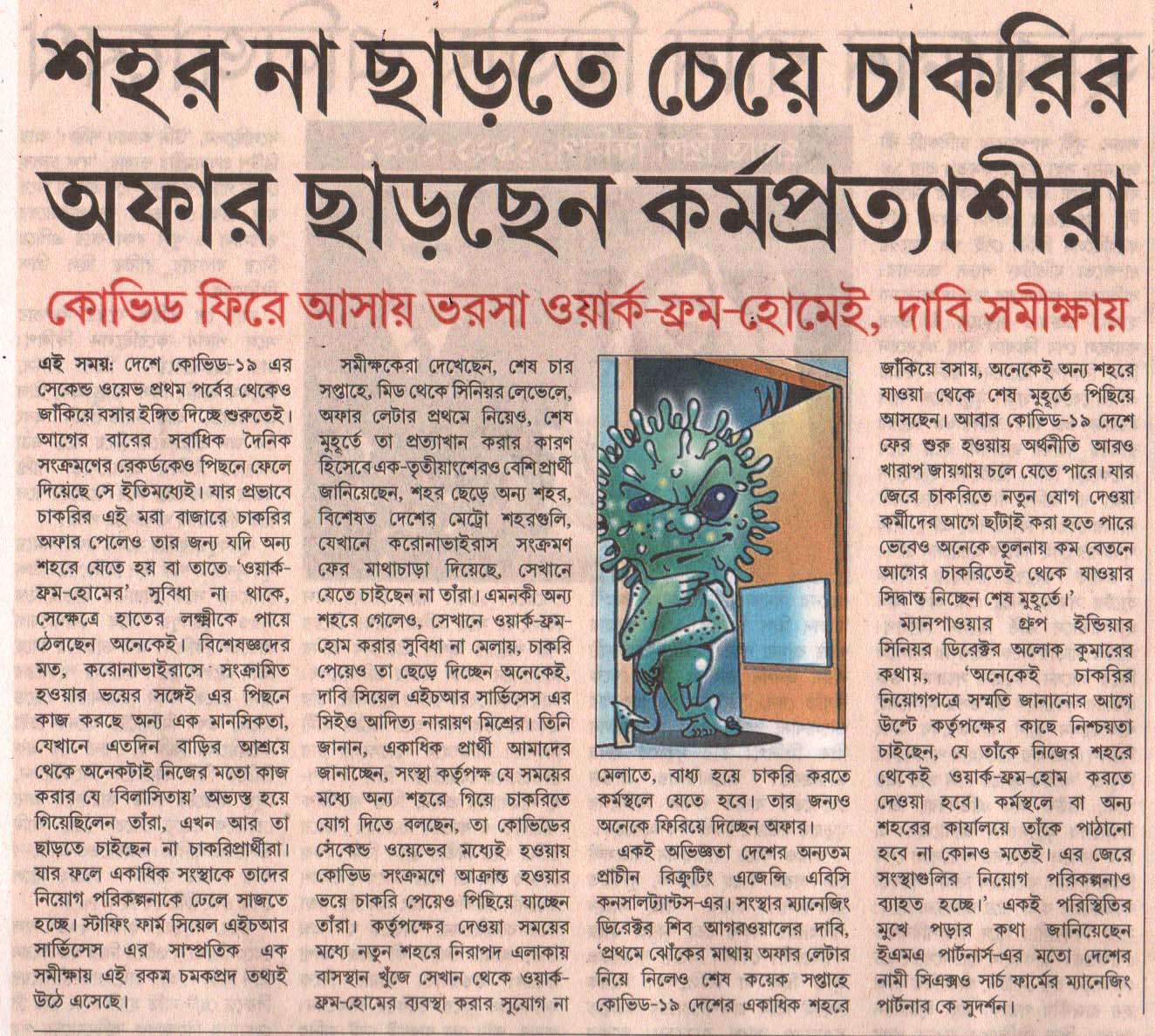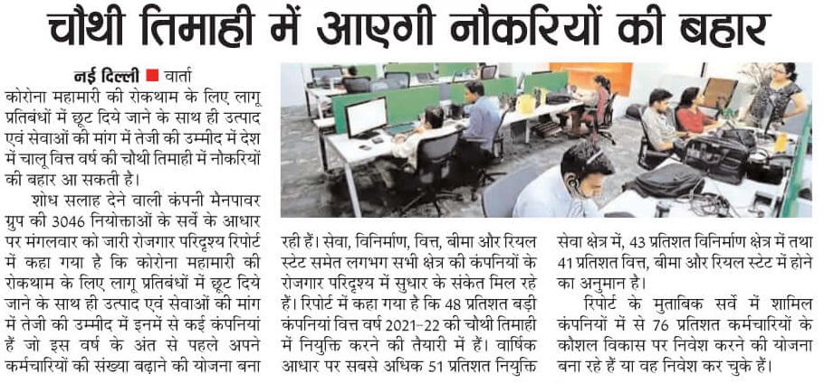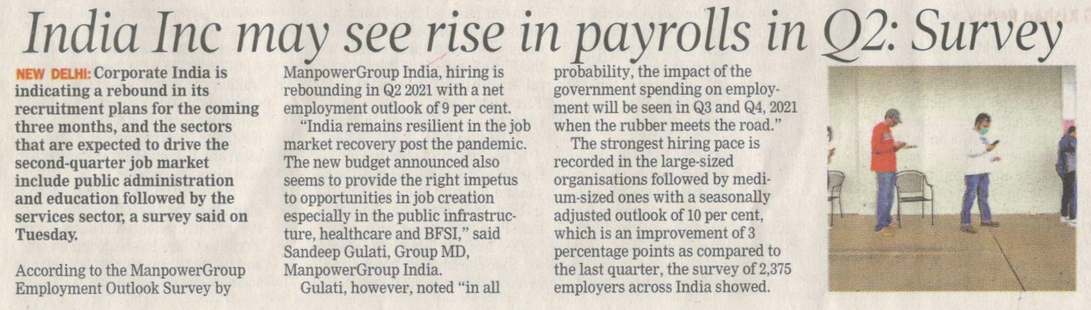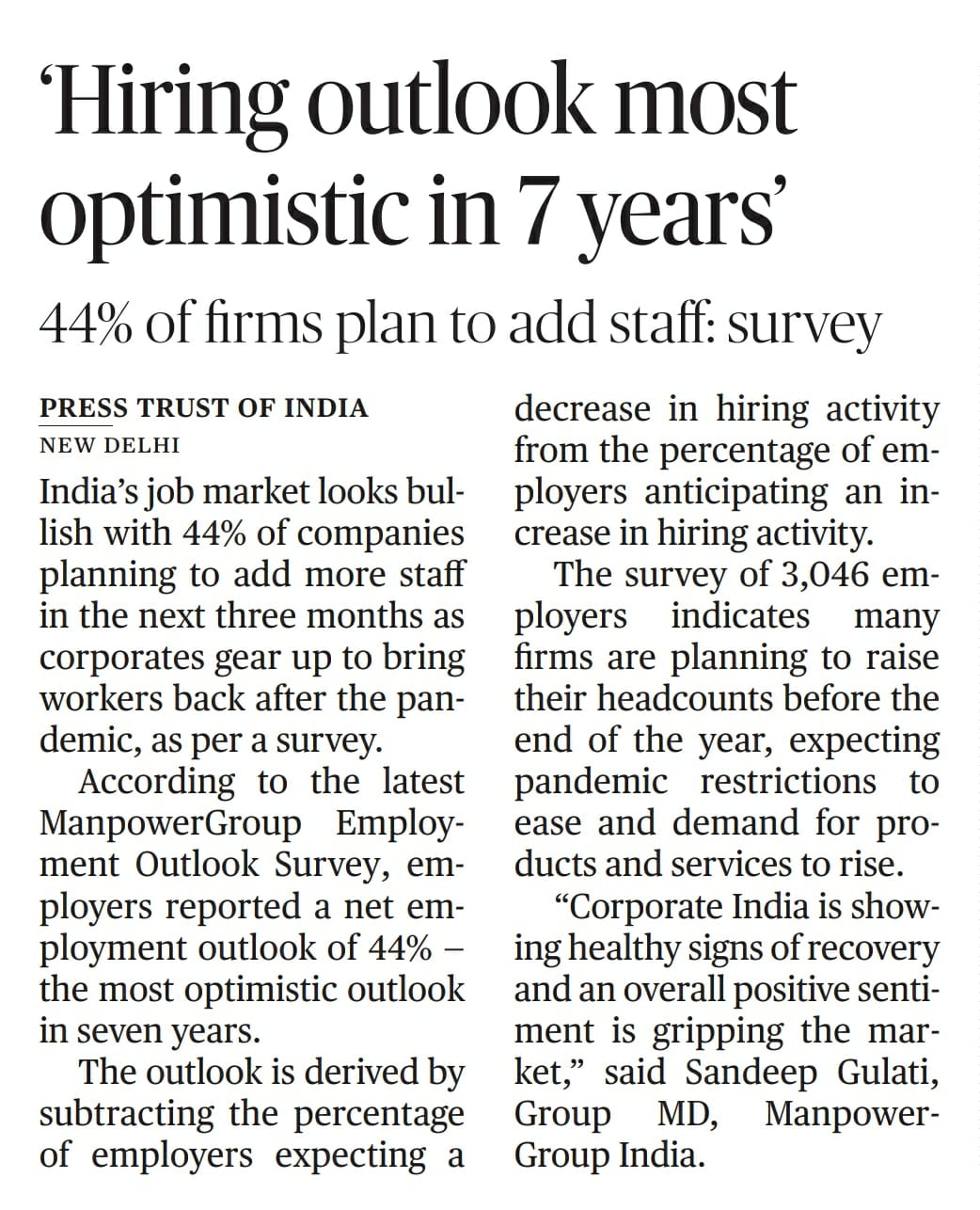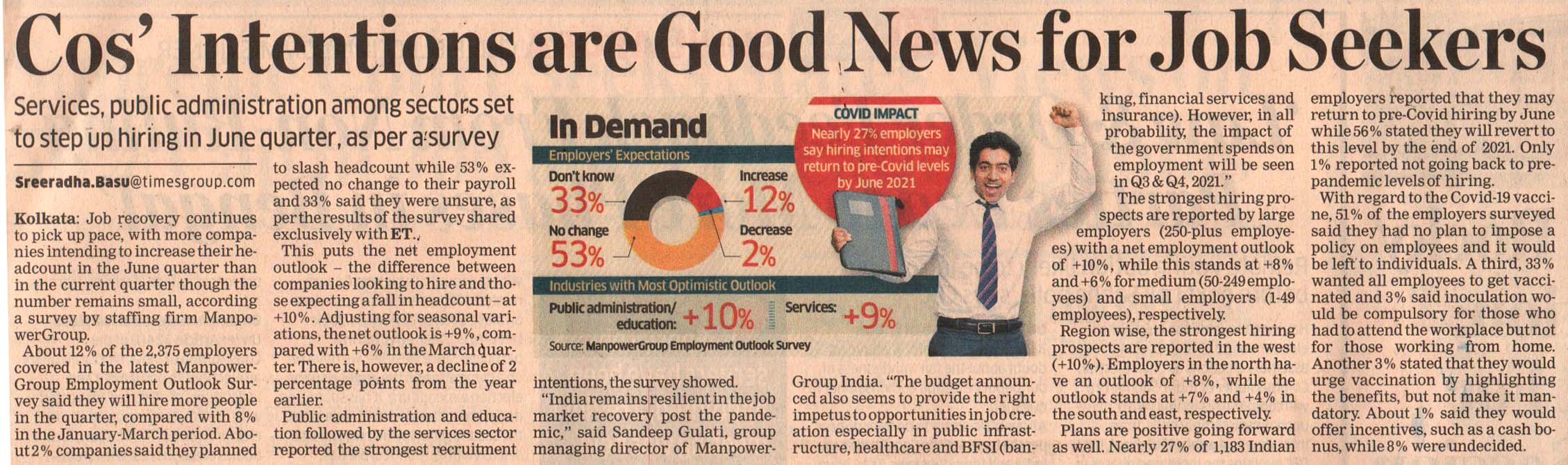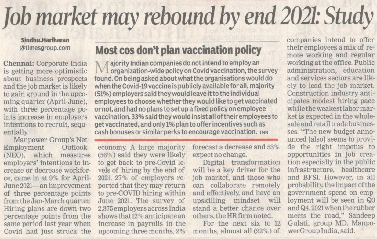 The article talks about how the decline in Covid cases as well as fatalities and the imminent vaccine roll-out for the masses have proven to be the foremost factors giving an impetus to the battered job market. Mr Sandeep said “We can safely say that we are at 80-90% of the pre-Covid job market”. He also said “Covid is behind us and the new normal is making its move at a faster pace. The decline in Covid cases and vaccination drive by GoI has overall boosted the sentiments of the economy”.