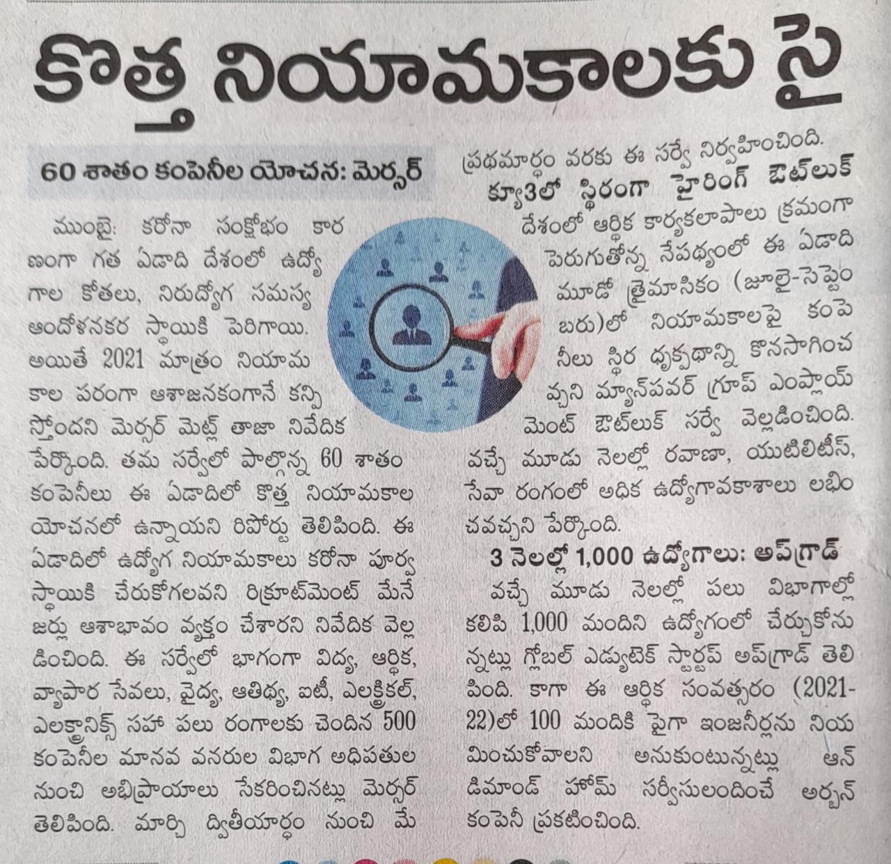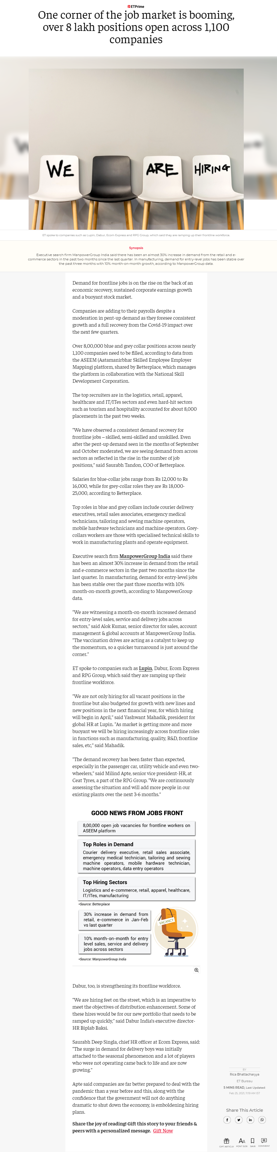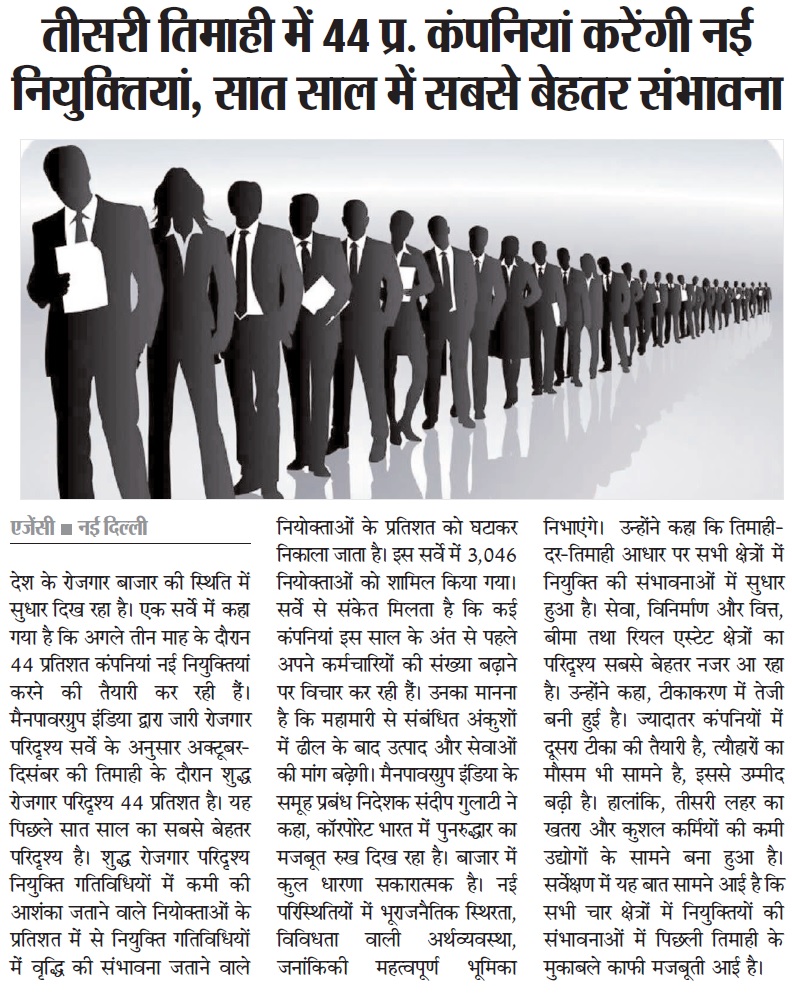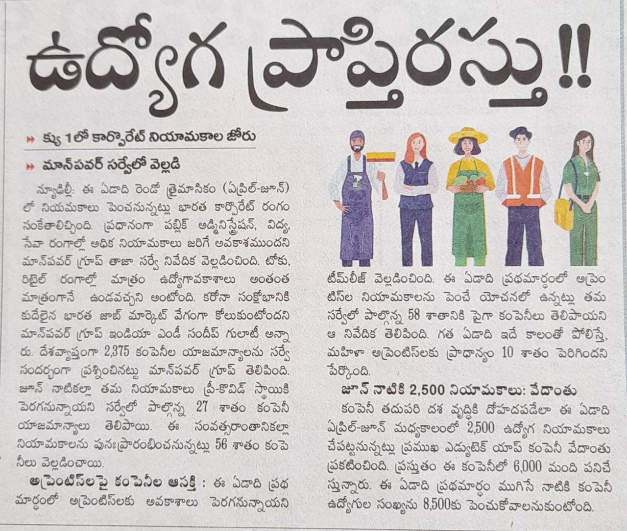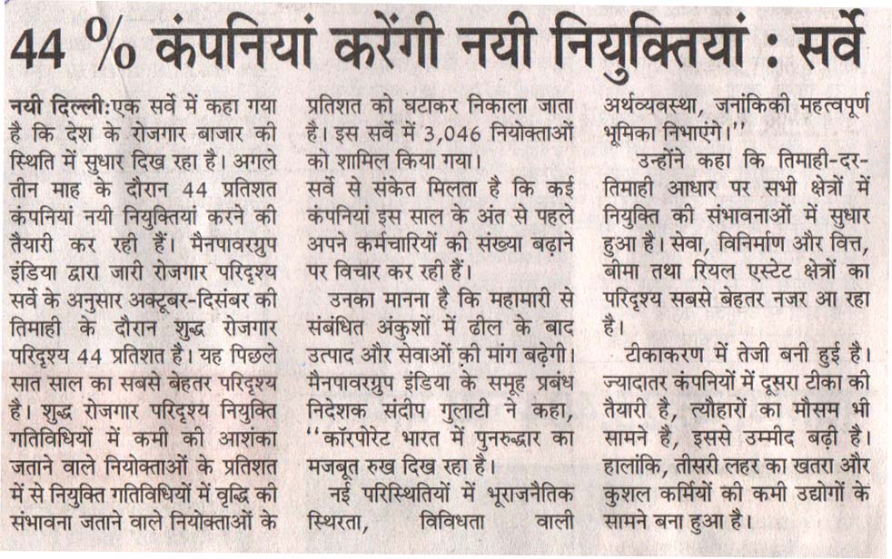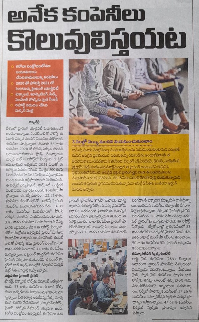 The article talks about how the decline in Covid cases as well as fatalities and the imminent vaccine roll-out for the masses have proven to be the foremost factors giving an impetus to the battered job market. Mr Sandeep said “We can safely say that we are at 80-90% of the pre-Covid job market”. He also said “Covid is behind us and the new normal is making its move at a faster pace. The decline in Covid cases and vaccination drive by GoI has overall boosted the sentiments of the economy”.
