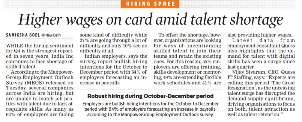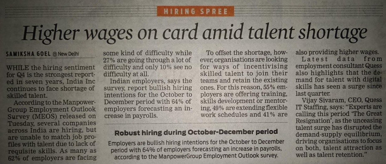 The article talks about the case of Great Resignation aka Big Quit as Indian software vendors are struggling to retain digital talent – the most sought-after in the IT industry today – so much so that nearly 50 per cent of them move out, mostly to another company for a higher pay. This, in turn, has created a huge demand and supply problem for digital talent. A few years ago, this was the trend with software engineers. Commenting about the demand Mr Sanju says “The digitisation of business environment is creating an unprecedented demand for talent in digital skills. “While the high demand is leading to high attrition, we believe this will rationalise, and this situation should ease up in 2 to 3 quarters,”