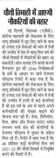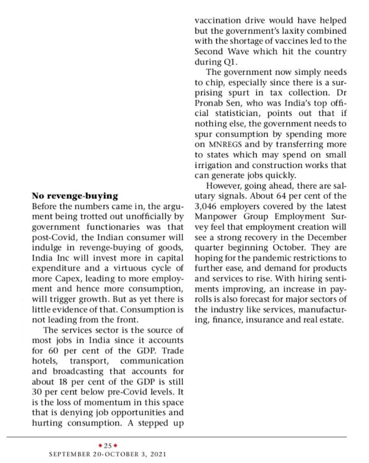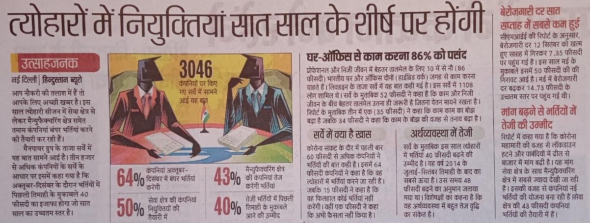 The article talks about the employment condition change, as the base effect of the pandemic wears off this month, the true picture of the economy will emerge. A lot now depends on consumer demand. It has mentioned the data taken from the MEOS survey mention “No revenge buying” which says About 64 percent of 3046 employers covered by the ManpowerGroup Employment survey feel that employment creation will see a strong recovery in December quarter beginning October. They are hoping for the pandemic restrictions to further ease, and demands for products and services to rise.
