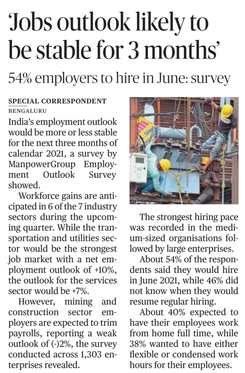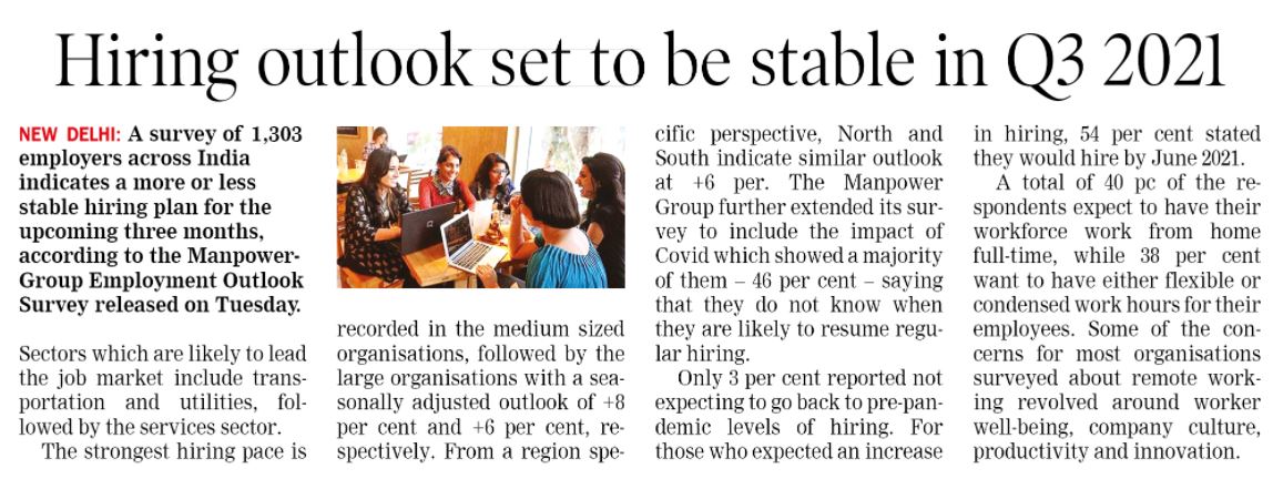 The article is about the MEOS Q2 Survey released today by ManpowerGroup India, the survey of 2375 employers across India indicates a rebound in hiring plans for the upcoming three months.