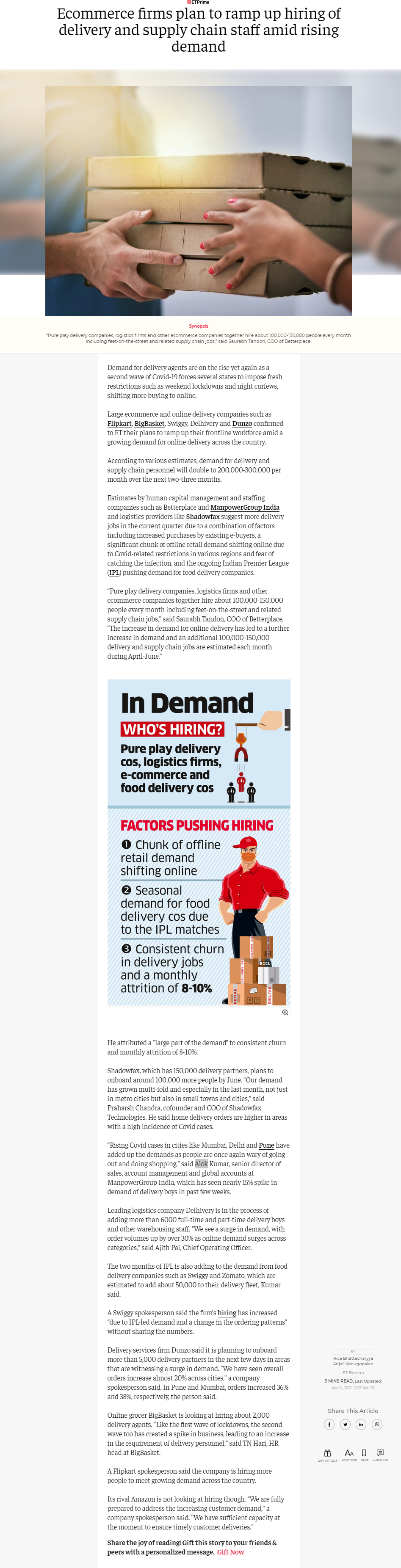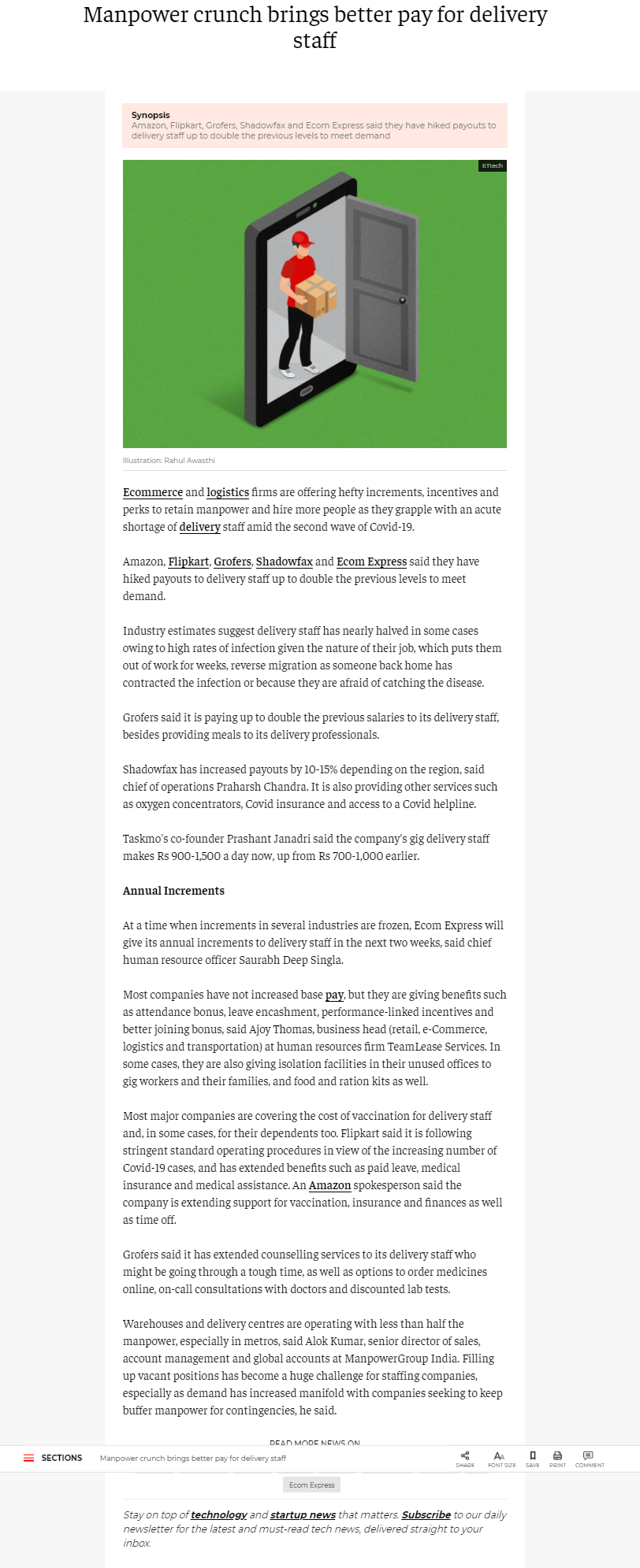 The article talks about Facing an acute shortage of delivery staff amid the second Covid wave, e-commerce firms including Amazon, Flipkart, Grofers, and logistics firms like Shadowfax and Ecom Express, are offering big increments, apart from incentives and perks to retain existing delivery personnel and bring more on board. Delivery staff has nearly halved in some places, owing to high rates of infection due to the nature of their job, said industry insiders. Warehouses and delivery centres are operating on less than half strength, especially in metros, according to Alok Kumar at ManpowerGroup India.