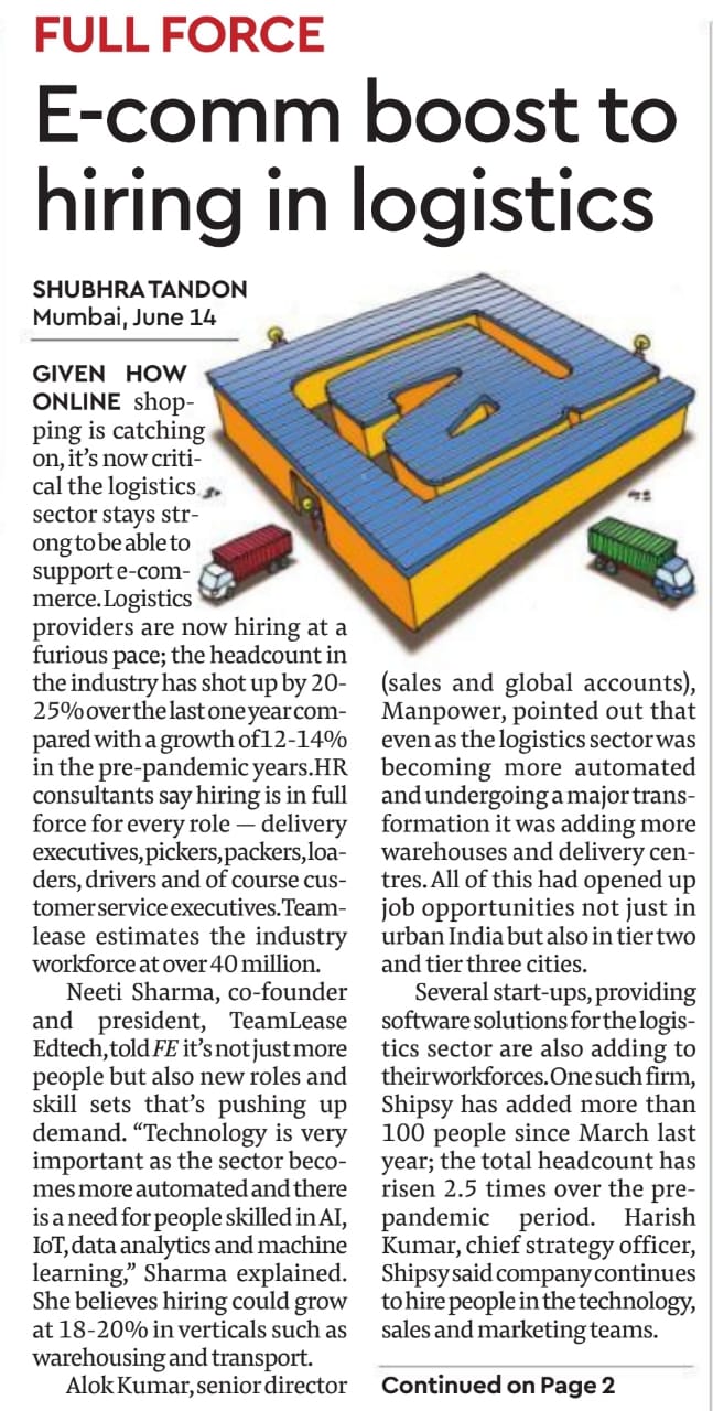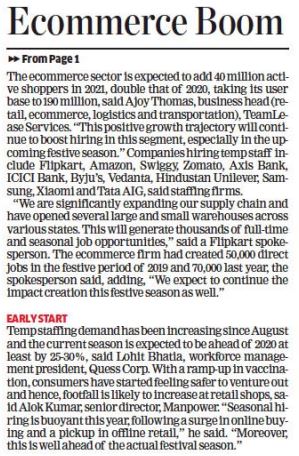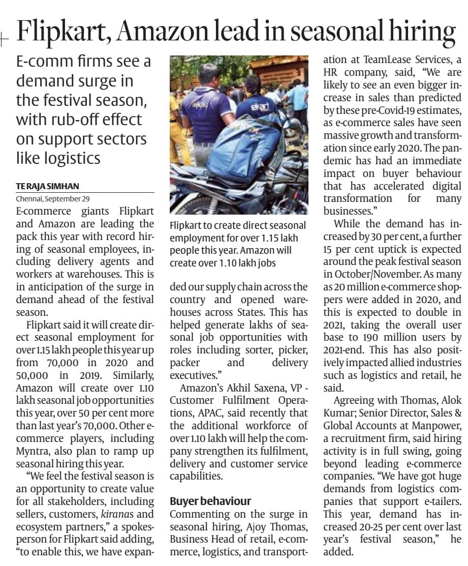 The article talks about how E-comm firms see a demand surge in the festival season, with rub-off effect on support sectors like logistics. E-commerce giants Flipkart and Amazon are leading the pack this year with record hiring of seasonal employees, including delivery agents and workers at warehouses. This is in anticipation of the surge in demand ahead of the festival season. Alok Kumar; Senior Director, Sales & Global Accounts at Manpower, a recruitment firm, said "Hiring activity is in full swing, going beyond leading e-commerce companies. We have got huge demands from logistics companies that support e-tailers. This year, demand has increased 20-25 per cent over last year’s festival season,”