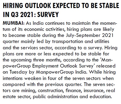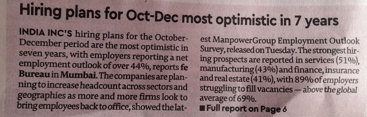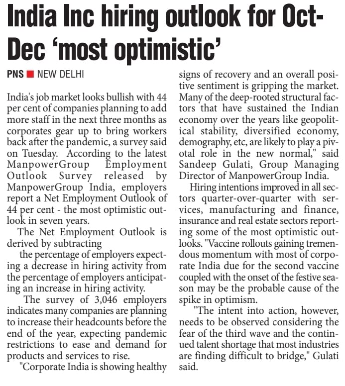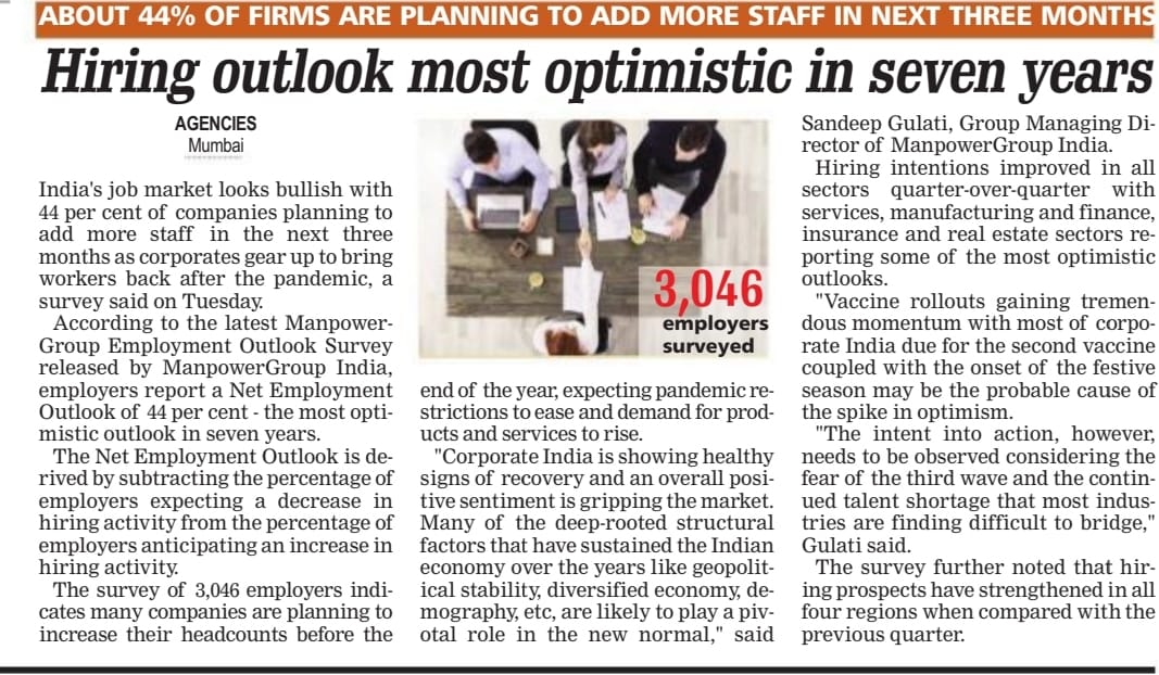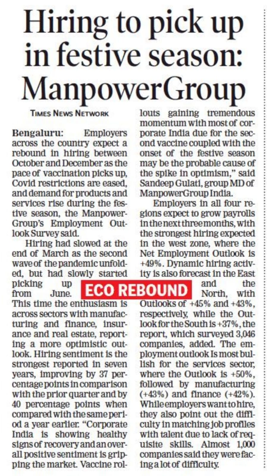The coverage is on the MEOS survey released yesterday, Employers In India Report Optimistic Hiring Outlook For Q4, Though Talent. The survey of 3046 employers indicates many companies are planning on increasing their headcounts before the end of the year, expecting pandemic restrictions to ease and demand for products and services to rise. Hiring intentions improved in all sectors quarter-over-quarter Shortages Continue with Services, Manufacturing and Finance, Insurance and Real Estate sectors reporting some of the most optimistic Outlooks.