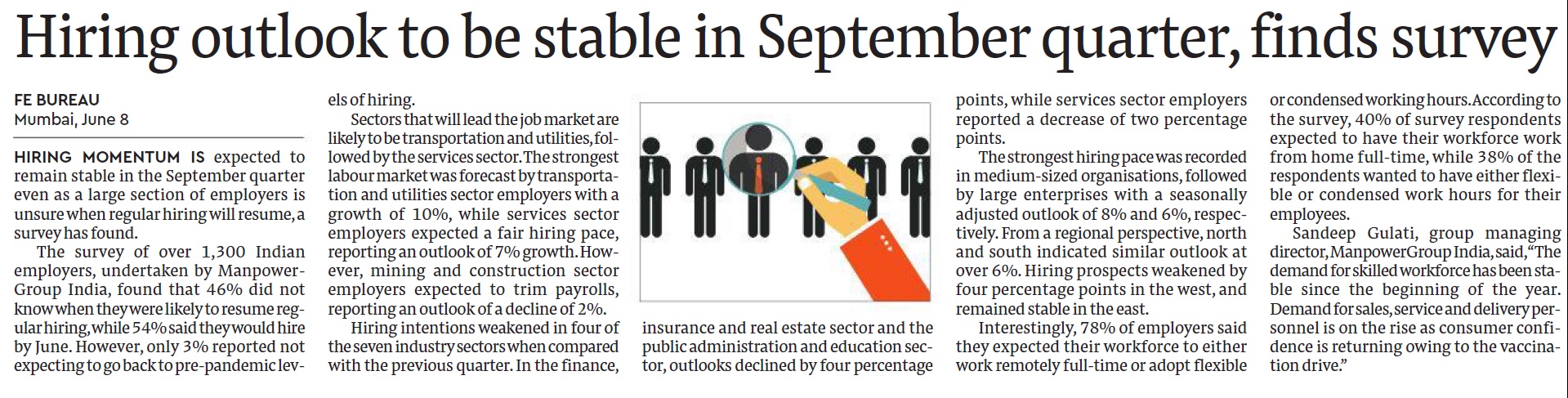 Read MoreHiring activity to recover in June, says ManpowerGroup Employment Outlook Survey