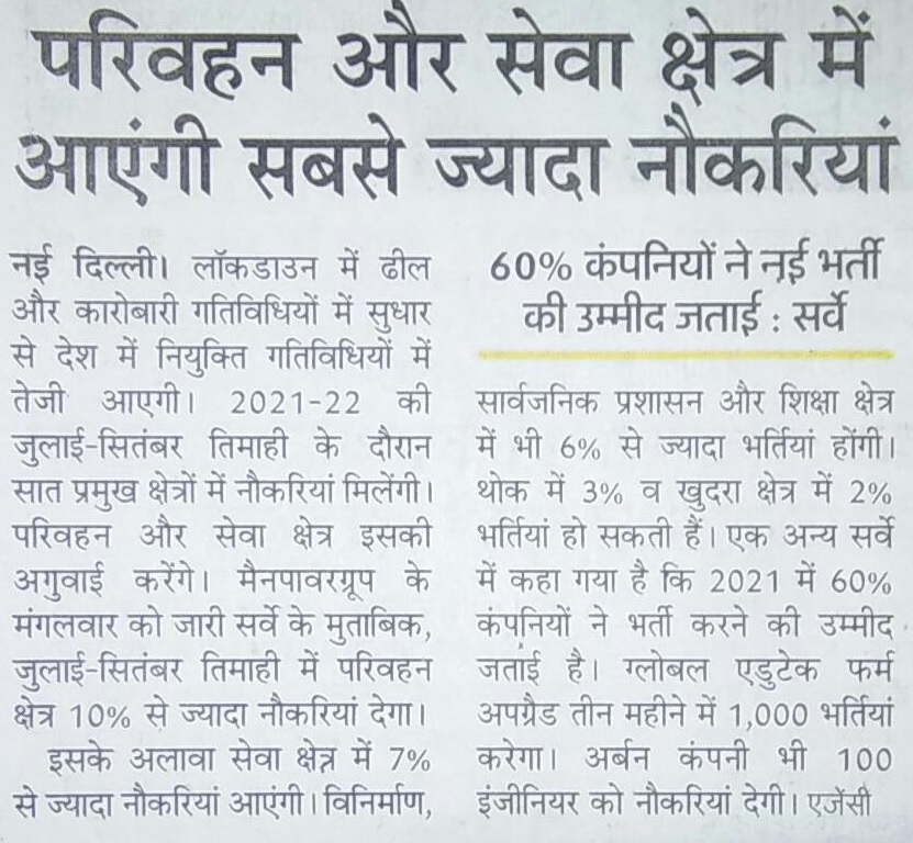 The article talks about how the decline in Covid cases as well as fatalities and the imminent vaccine roll-out for the masses have proven to be the foremost factors giving an impetus to the battered job market. Mr Sandeep said “We can safely say that we are at 80-90% of the pre-Covid job market”. He also said “Covid is behind us and the new normal is making its move at a faster pace. The decline in Covid cases and vaccination drive by GoI has overall boosted the sentiments of the economy”.